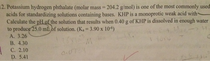 Cm B C) 90 Potassium hydrogen phthalate (KHP) is a widely used primary standard (functioning as a mono- protic acid) for acid/base titrations. ... View Doc