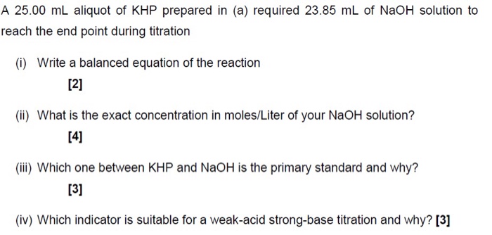 Titration of NaOH with potassium hydrogen phthalate to determine the molarity of NaOH (Text reference for titration: 19.4) Titration is a common lab procedure that gives highly reproducible results for a variety ... Read More